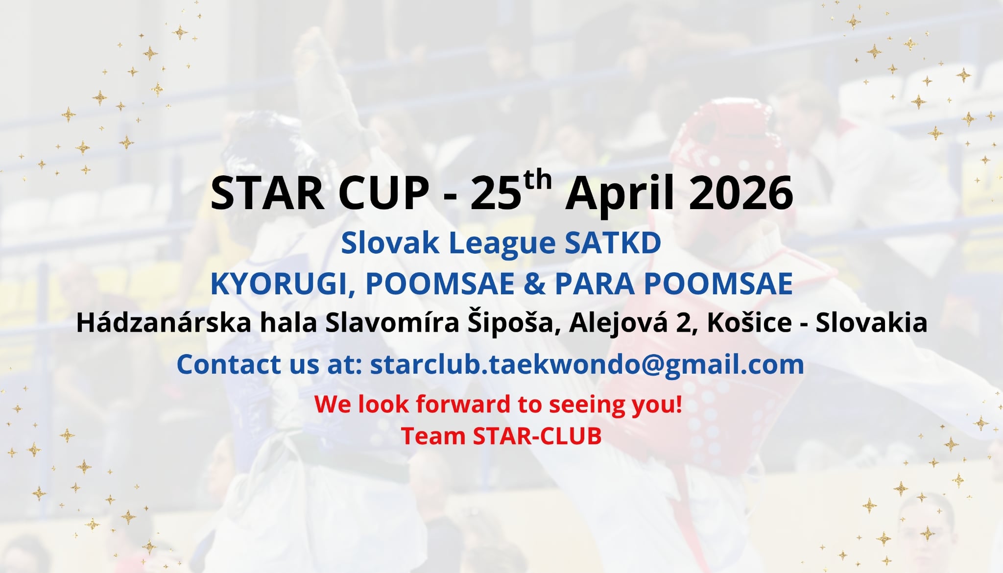Pozývame všetkých športovcov, trénerov a fanúšikov taekwonda na STAR CUP 2026, ktorý sa uskutoční 25.apríla 2026. Pripravte sa na deň plný bojovnosti, disciplíny a skvelých výkonov v duchu fair-play. Či už ste fanúšikom dynamického Kyorugi alebo precízneho Poomsae na Star Cupe nesmiete chýbať!